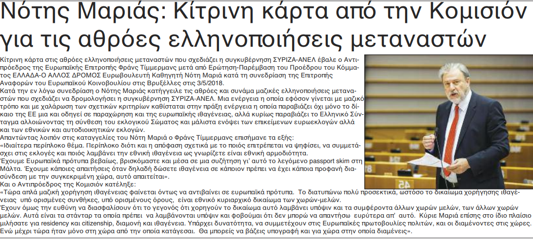 Έγραψαν: «Εθνική Φωνή» 21-5-2018 (Νότης Μαριάς: Κίτρινη κάρτα από την Κομισιόν για τις αθρόες ελληνοποιήσεις μεταναστών)