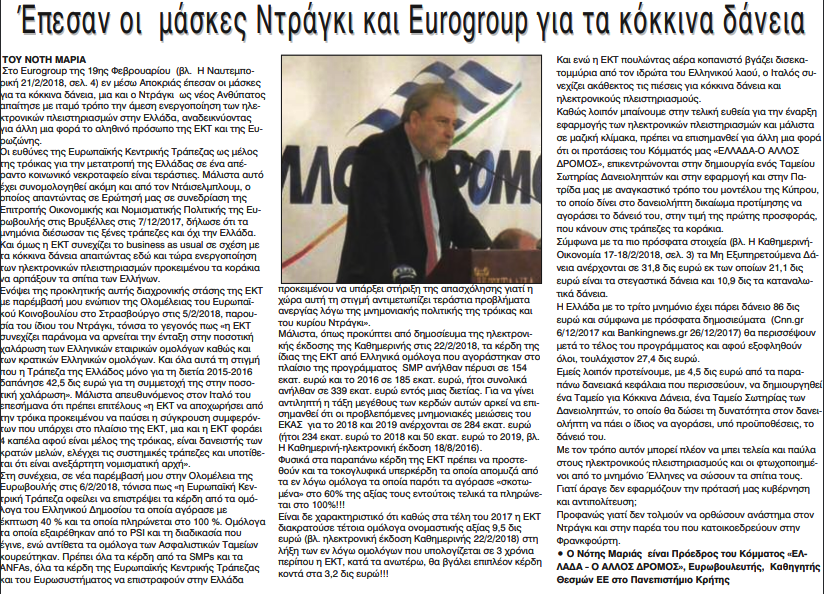 Έγραψαν: «Εθνική Φωνή» 26-2-2018 (Έπεσαν οι μάσκες Ντράγκι και Εurogroup για τα κόκκινα δάνεια.)