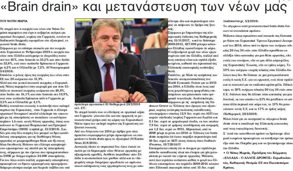 Έγραψαν: «Εθνική Φωνή» 30-4-2018 («Brain drain» και μετανάστευση των νέων μας)