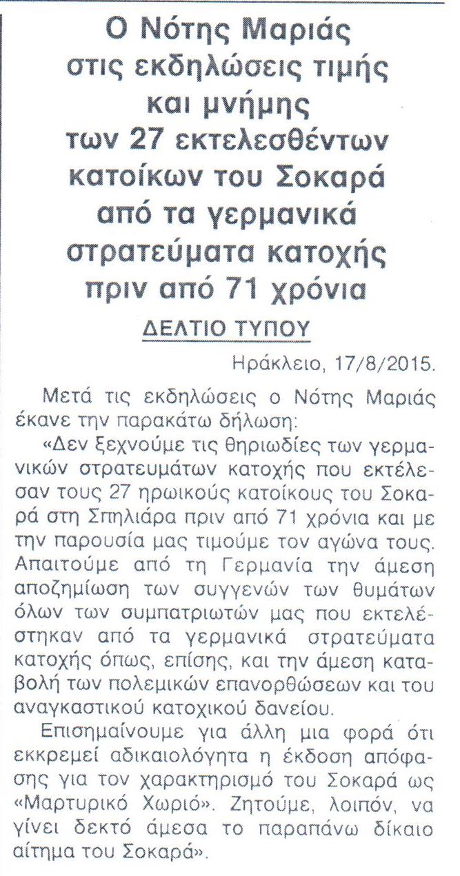 Έγραψαν: Μνήμη & Χρέος Ιουλίου – Αυγούστου 2015 (στις εκδηλώσεις τιμής και μνήμης των 27 εκτελεσθέντων κατοίκων του Σοκαρά από τα γερμανικά στρατεύματα κατοχής)