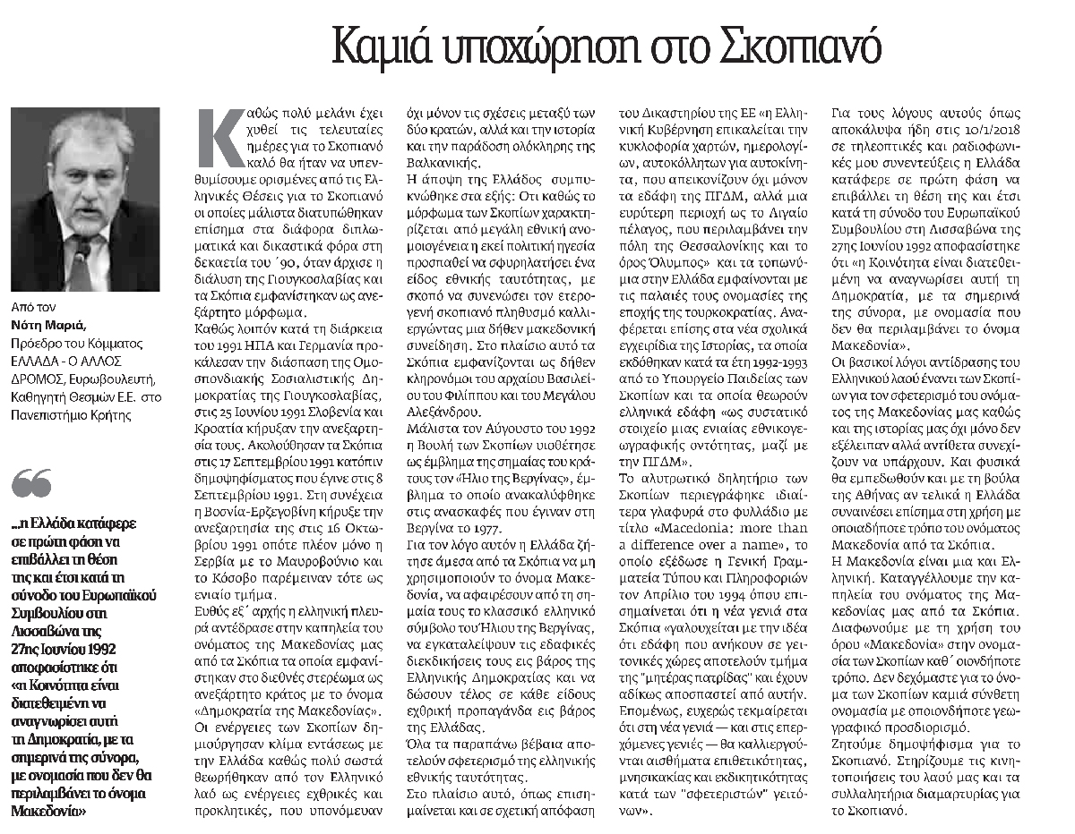 Έγραψαν: «Νέα Εγνατία» 15-01-2018 (Καμιά υποχώρηση στο Σκοπιανό)