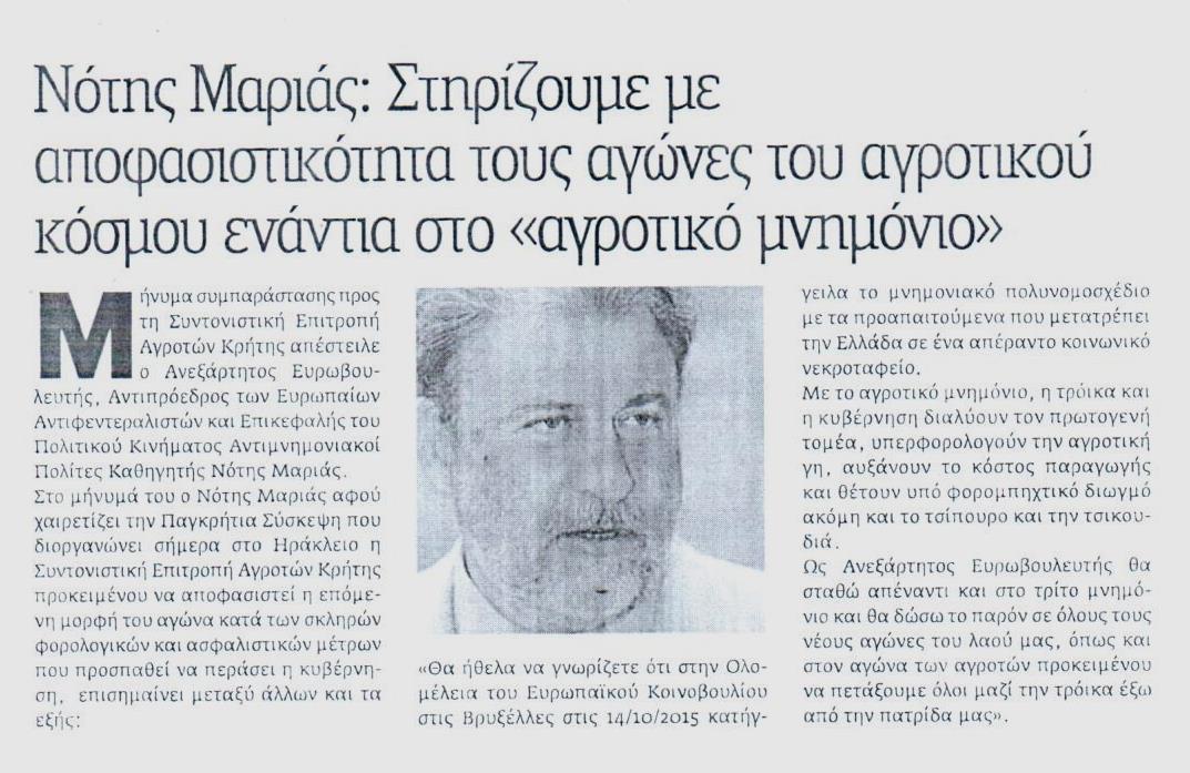 Έγραψαν: Νέα Εγνατία 22.10.2015 (Στηρίζουμε με αποφασιστικότητα τους αγώνες του αγροτικού κόσμου ενάντια στο «αγροτικό μνημόνιο»)