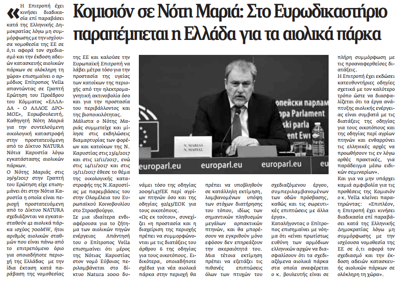 Έγραψαν: «Νέα Εγνατία» 30-11-2017 (Κομισιόν σε Νότη Μαριά: Στο Ευρωδικαστήριο παραπέμπεται η Ελλάδα για τα αιολικά πάρκα)