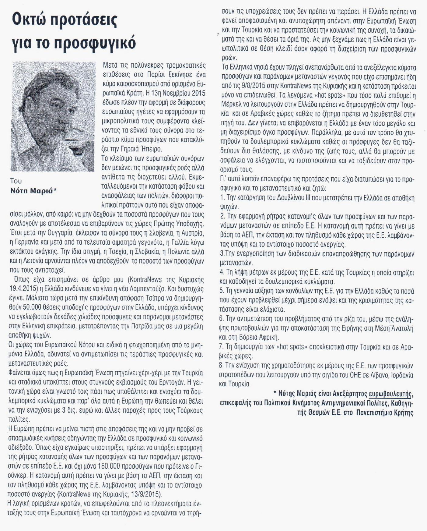 Έγραψαν: Νέα Κρήτη 1.12.2015 (Οκτώ προτάσεις για το προσφυγικό)