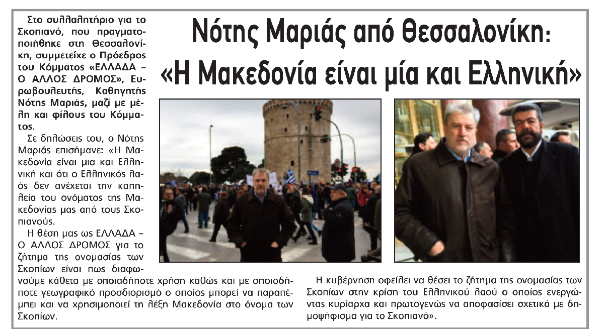 Έγραψαν: «Τα Νέα της Αιτωλοακαρνανίας» 24-01-2018 (Νότης Μαριάς από Θεσσαλονίκη: «Η Μακεδονία είναι μία και Ελληνική»)