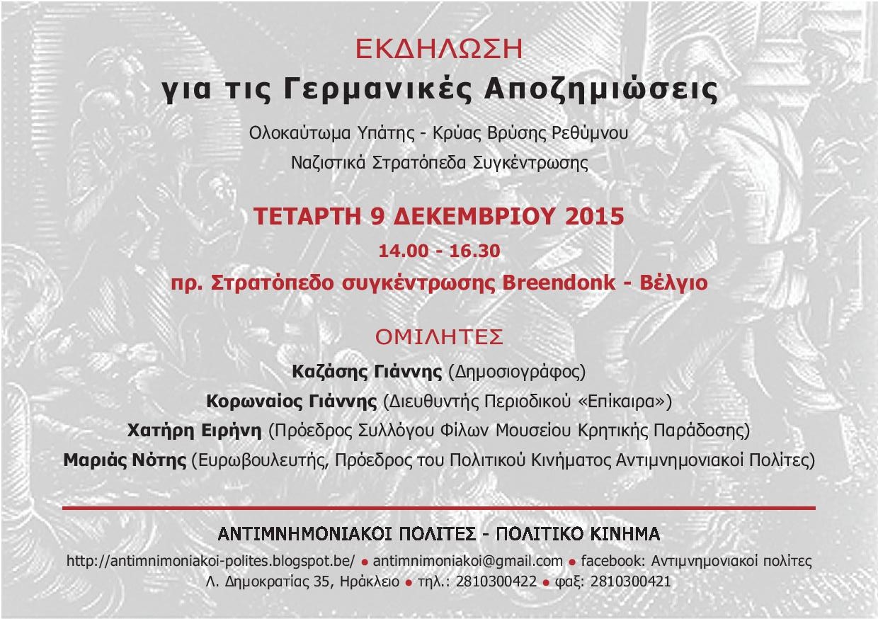 Η εκδήλωση θα γίνει στις 9 Δεκεμβρίου, ώρα 14.00, στο πρώην ναζιστικό στρατόπεδο συγκέντρωσης Μπρέντοκ (Μemorial National du fort de Breendonk), χώρο ιδιαίτερης ιστορικής μνήμης αφού εκεί μαρτύρησαν χιλιάδες πατριώτες.