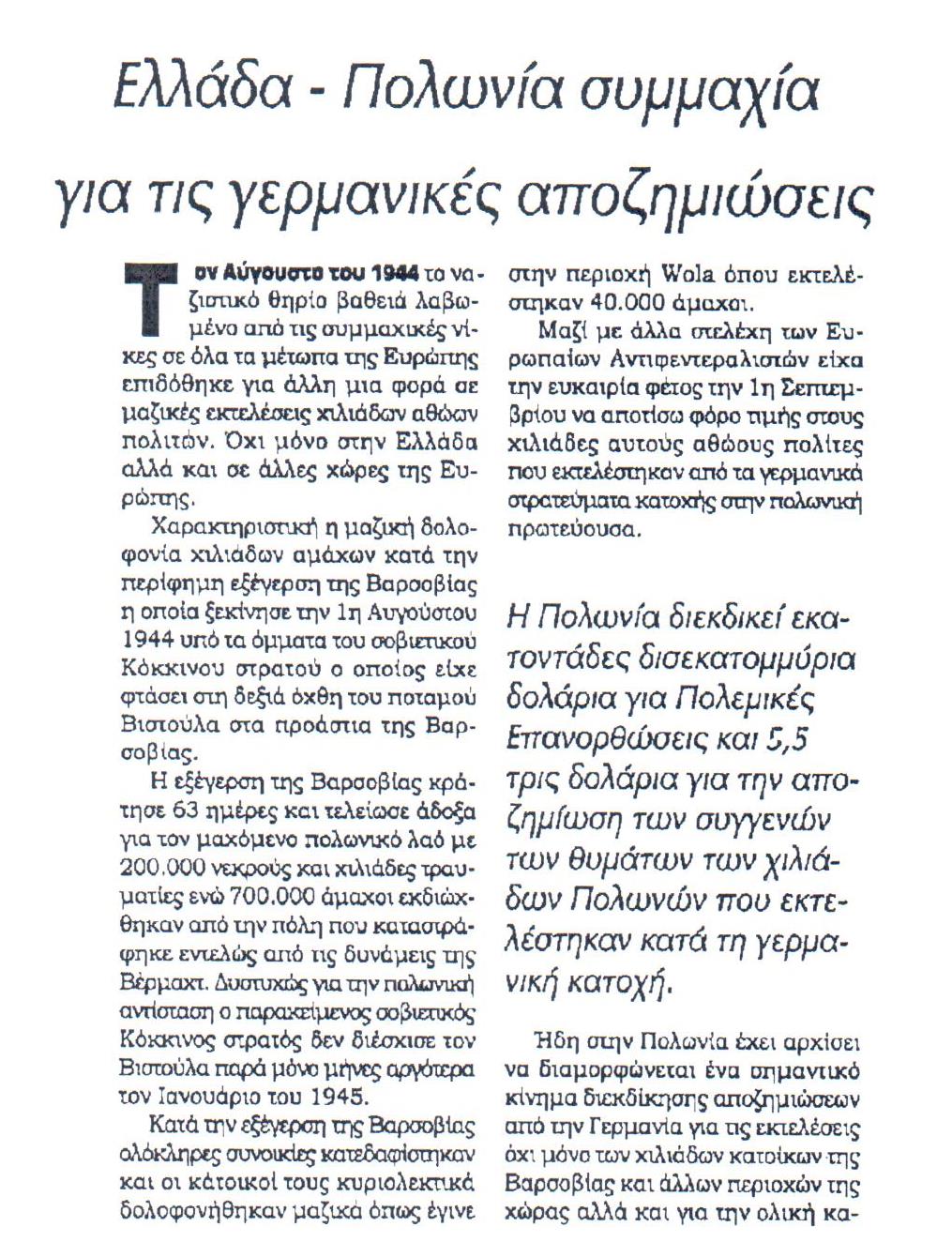 Ήδη στην Πολωνία έχει αρχίσει να διαμορφώνεται ένα σημαντικό κίνημα διεκδίκησης αποζημιώσεων από τη Γερμανία για τις εκτελέσεις όχι μόνο των χιλιάδων κατοίκων της Βαρσοβίας και άλλων περιοχών της χώρας αλλά και για την ολική καταστροφή των υποδομών και της οικονομίας της χώρας από τα εκεί γερμανικά στρατεύματα κατοχής,