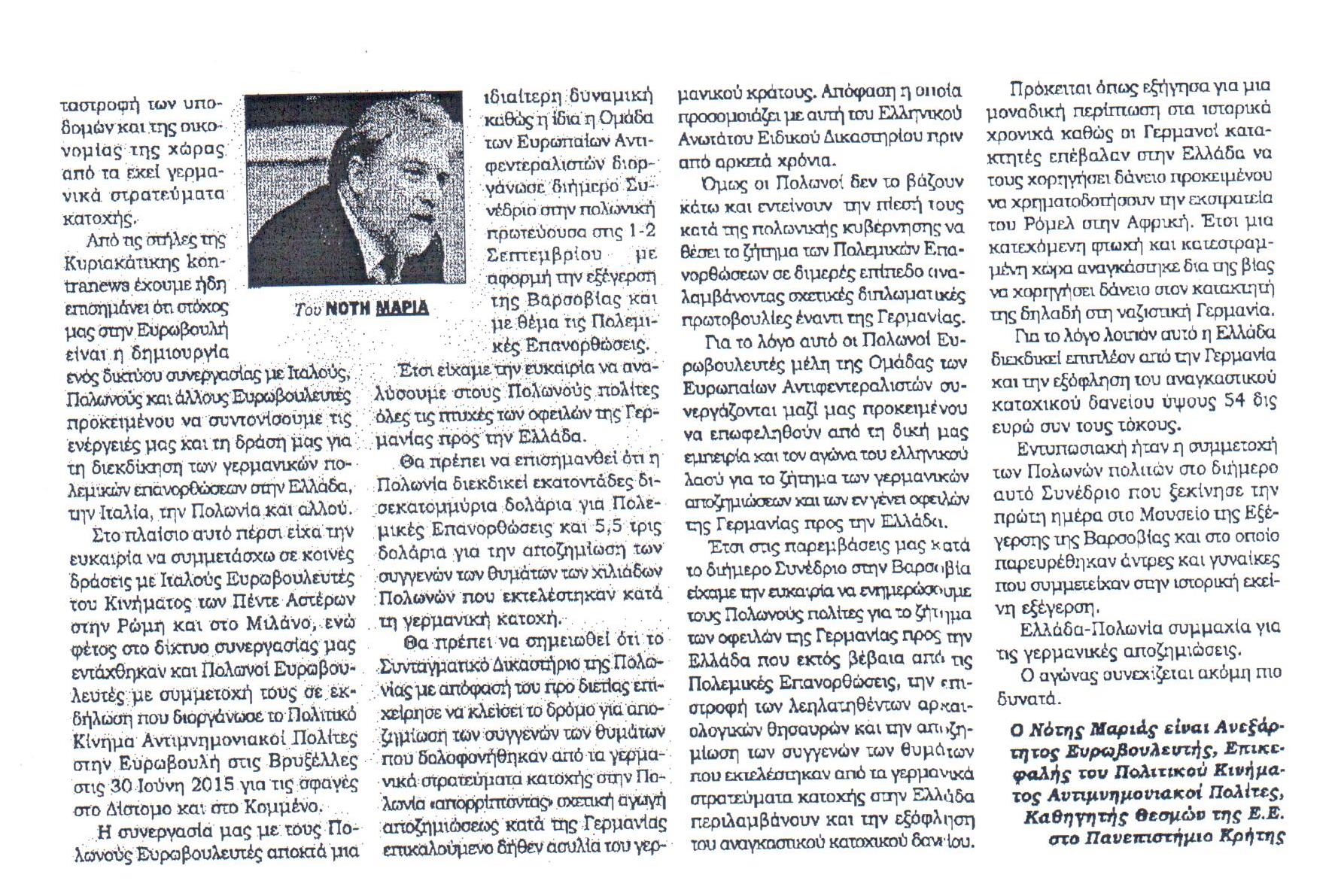 Από τις στήλες της Κυριακάτικης Kontra News έχουμε ήδη επισημάνει ότι στόχος μας στην Ευρωβουλή είναι η δημιουργία ενός δικτύου συνεργασίας με Ιταλούς, Πολωνούς και άλλους Ευρωβουλευτές προκειμένου να συντονίσουμε τις ενέργειές μας και τη δράση μας για τη διεκδίκηση των γερμανικών πολεμικών επανορθώσεων στην Ελλάδα, την Ιταλία την Πολωνία και αλλού.