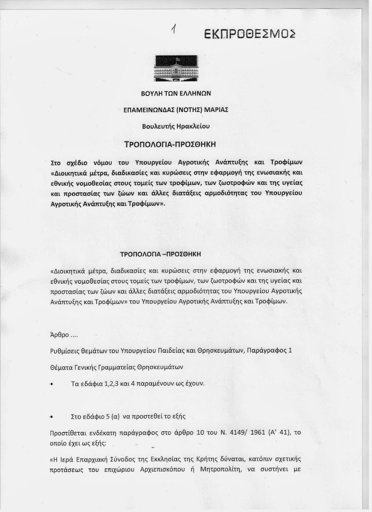 Σε συνέχεια σχετικής επιστολής της Ιεράς Επαρχιακής Συνόδου της Εκκλησίας της Κρήτης προς τον Κοινοβουλευτικό Εκπρόσωπο των Ανεξάρτητων Ελλήνων κ. Νότη Μαριά για την κατάθεση σχετικής τροπολογίας προκειμένου να συμπεριληφθεί και η Εκκλησία της Κρήτης στις ευεργετικές για την Εκκλησία της Ελλάδος υπό ψήφιση διατάξεις και να μην εξαιρεθεί και αδικηθεί για ακόμη μια φορά, ο Κοινοβουλευτικός Εκπρόσωπος, Τομεάρχης Οικονομικών,  βουλευτής Ηρακλείου των Ανεξάρτητων Ελλήνων, Νότης Μαριάς, κατέθεσε στο νομοσχέδιο του ΥΠΑΑΤ, «Διοικητικά μέτρα, διαδικασίες και κυρώσεις στην εφαρμογή της ενωσιακής και εθνικής νομοθεσίας στους τομείς των τροφίμων, των ζωοτροφών και της υγείας και προστασίας των ζώων και άλλες διατάξεις αρμοδιότητας του Υπουργείου Αγροτικής Ανάπτυξης και Τροφίμων» του Υπουργείου Αγροτικής Ανάπτυξης και Τροφίμων. σχετική τροπολογία-προσθήκη  που αφορά στις ρυθμίσεις θεμάτων για την Εκκλησία της Κρήτης.