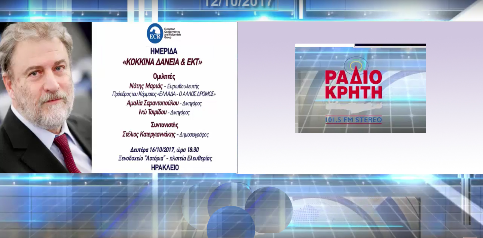 Συνέντευξη του Προέδρου του Κόμματος «ΕΛΛΑΔΑ – Ο ΑΛΛΟΣ ΔΡΟΜΟΣ», Ευρωβουλευτή Καθηγητή Νότη Μαριά, στις 16/10/2017 στο Ράδιο Κρήτη 101.5, για τα κόκκινα δάνεια, το μεταναστευτικό και την επίσκεψη Τσίπρα στις ΗΠΑ.