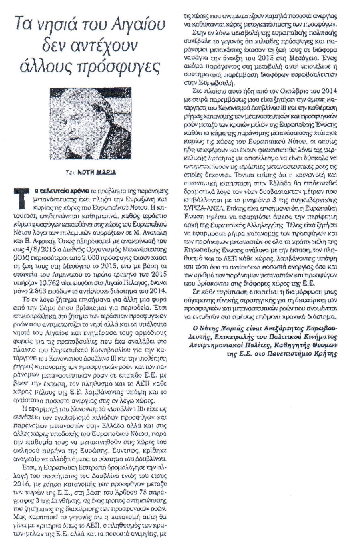 Το εν λόγω ζήτημα επισήμανα για άλλη μια φορά από τη Σάμο όπου βρίσκομαι για περιοδεία. Έτσι επικεντρώθηκα στο ζήτημα των τεράστιων προσφυγικών ροών που αντιμετωπίζει το νησί αλλά και τα υπόλοιπα νησιά του Αιγαίου και ενημέρωσα τους αρμόδιους φορείς για τις πρωτοβουλίες που έχω αναλάβει στο πλαίσιο του Ευρωπαϊκού Κοινοβουλίου για την κατάργηση του Κανονισμού Δουβλίνο ΙΙΙ και την υιοθέτηση ρήτρας κατανομής των προσφυγικών ροών και των παράνομων μεταναστευτικών ροών σε επίπεδο Ε.Ε. με βάση την έκταση, τον πληθυσμό και το ΑΕΠ κάθε χώρας μέλους της Ε.Ε. λαμβάνοντας υπόψη και το αντίστοιχο ποσοστό ανεργίας στις εν λόγω χώρες.
