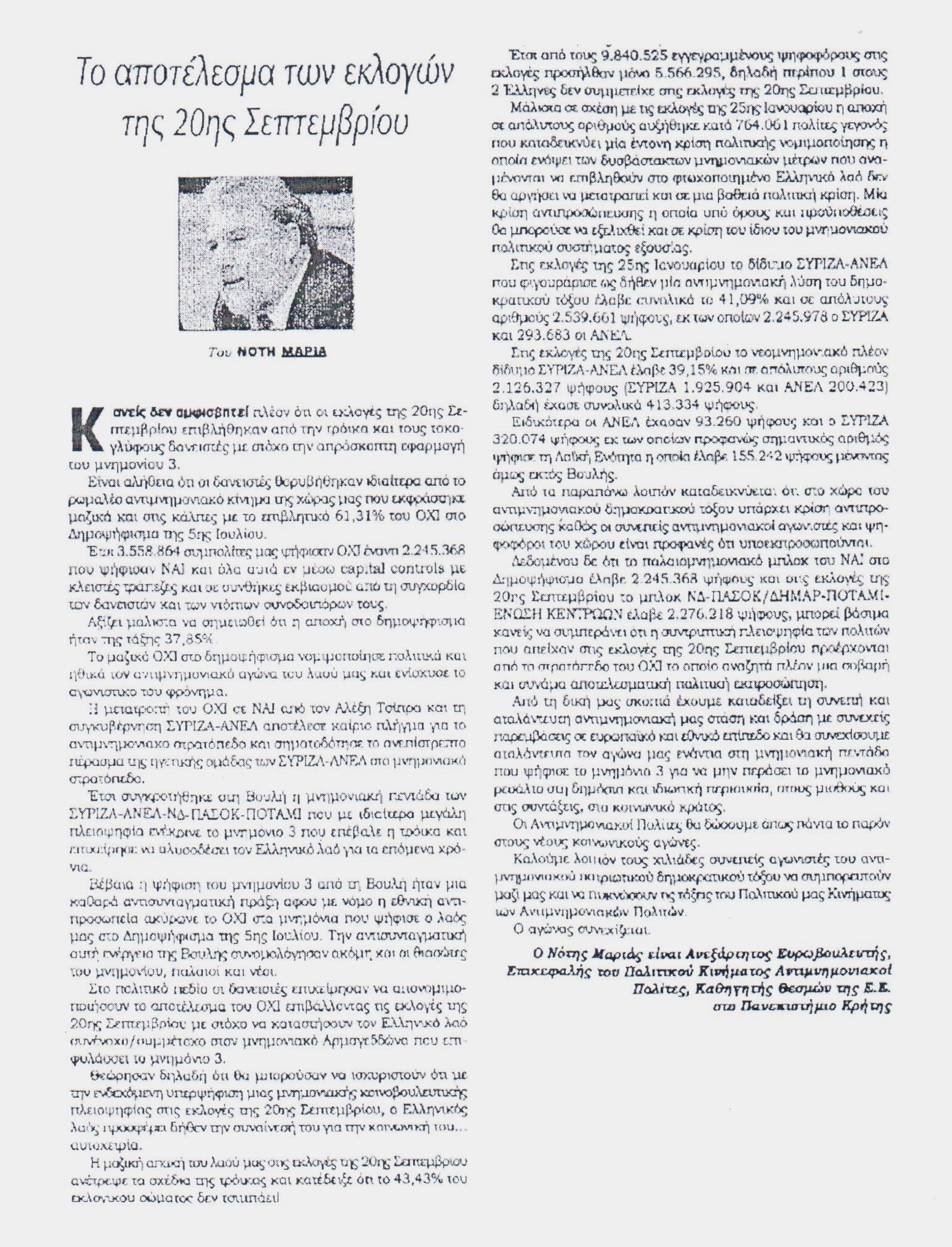 Δεδομένου δε ότι το παλαιομνημονιακό μπλοκ του ΝΑΙ στο Δημοψήφισμα έλαβε 2.245.368 ψήφους και στις εκλογές της 20ης Σεπτεμβρίου το μπλοκ ΝΔ-ΠΑΣΟΚ/ΔΗΜΑΡ-ΠΟΤΑΜΙ-ΕΝΩΣΗ ΚΕΝΤΡΩΩΝ έλαβε 2.276.218 ψήφους, μπορεί βάσιμα κανείς να συμπεράνει ότι η συντριπτική πλειοψηφία των πολιτών που απείχαν στις εκλογές της 20ης Σεπτεμβρίου προέρχονται από το στρατόπεδο του ΟΧΙ το οποίο αναζητά πλέον μια σοβαρή και συνάμα αποτελεσματική πολιτική εκπροσώπηση.