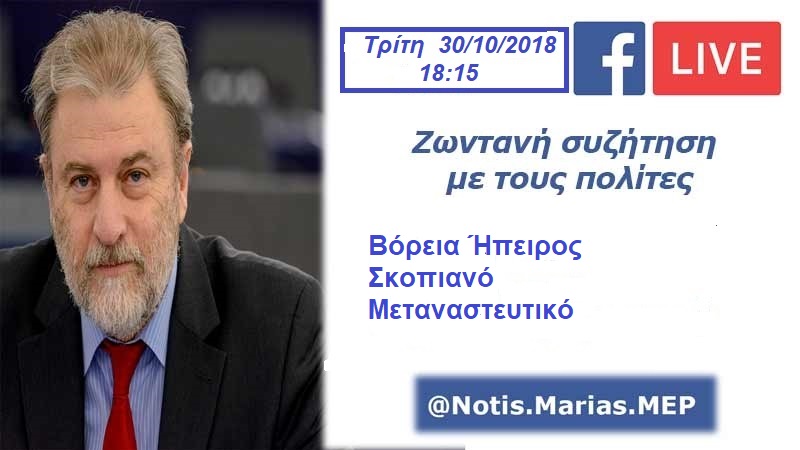 10η Ζωντανή Εκπομπή από Βρυξέλλες του Ευρωβουλευτή και μέλους του ECR, Καθηγητή Νότη Μαριά στο Facebook την Τρίτη 30/10/2018 στις 18:15