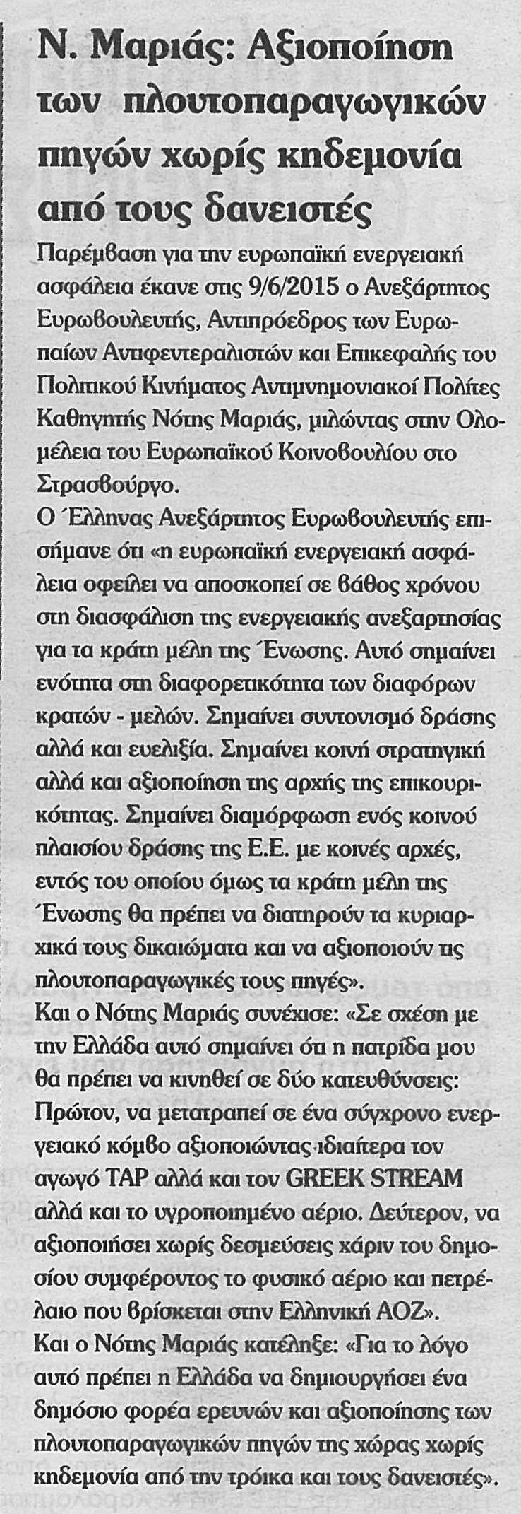 Αθήνα, 15/6/2015. ΔΕΛΤΙΟ ΤΥΠΟΥ Άρθρο του Ανεξάρτητου Ευρωβουλευτή, Αντιπροέδρου των Ευρωπαίων Αντιφεντεραλιστών...