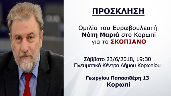 ΠΡΟΣΚΛΗΣΗ: Ομιλία του Ευρωβουλευτή Νότη Μαριά (ECR) στο Κορωπί για το ΣΚΟΠΙΑΝΟ, το Σάββατο 23/6/2018 0