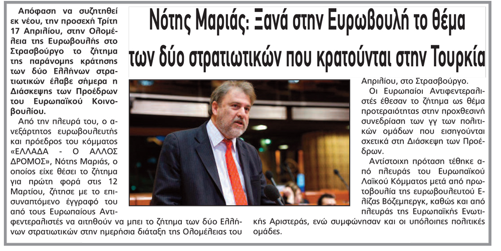 Έγραψαν: «Νέα Εγνατία» 16-4-2018 (Νότης Μαριάς: Ξανά στην Ευρωβουλή το θέμα των δύο στρατιωτικών που κρατούνται στην Τουρκία) 0